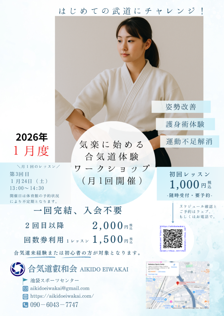 - 2026年1月の月イチ合気道のお知らせ武道未経験でも安心。合気道の動きでからだと心をリフレッシュしませんか? 毎月1回、不定期の土曜日に「合気道体験… 続きを読む: 2026年1月の月イチ合気道のお知らせ